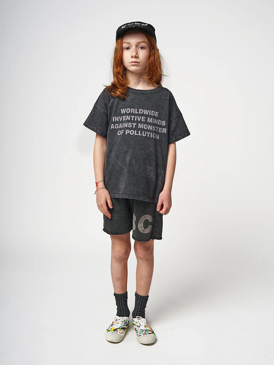 67% organic cotton 33% recycled cotton dark heather grey bermuda trousers. Designed with elasticated waistband, side pocket, raw edge bottom and low. It has a straight fit. Made in Spain